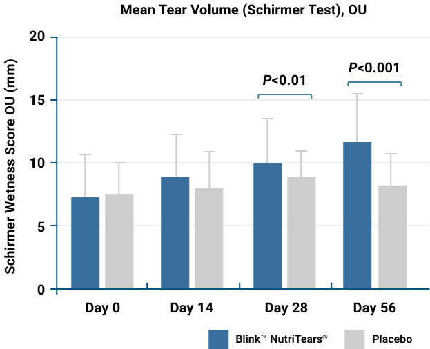 The overall mean tear volume of both eyes was significantly better for the BlinkTM NutriTears® group at Day 56.